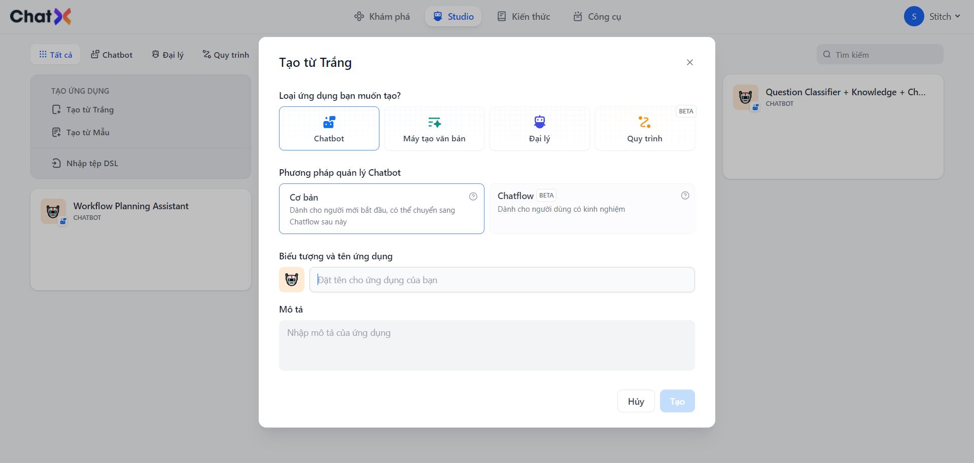 ChatX cung cấp hai loại ứng dụng: ứng dụng trò chuyện tương tự như ChatGPT, liên quan đến đối thoại nhiều lượt, và các ứng dụng tạo văn bản trực tiếp tạo ra nội dung văn bản chỉ với một cú nhấp chuột. Vì chúng tôi muốn tạo một bot Yêu Cầu Giữa Hành Trình, nên chúng tôi sẽ chọn ứng dụng tạo văn bản.