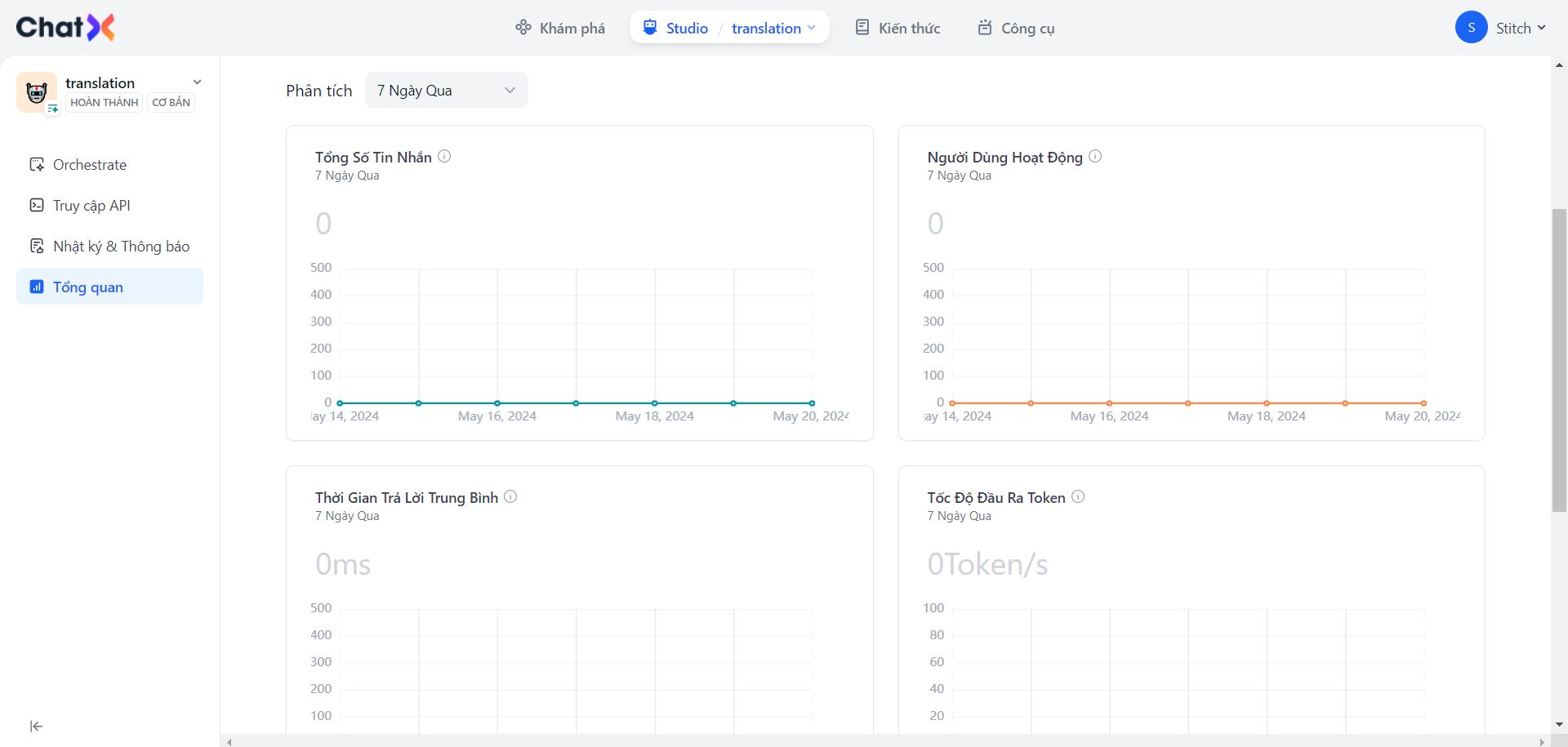 Sau khi bạn đã tạo ứng dụng của mình, trang tổng quan sẽ hiển thị một số dữ liệu giám sát và cài đặt ứng dụng. Nhấp vào "Orchestrate" ở phía bên trái, đây là trang làm việc chính.