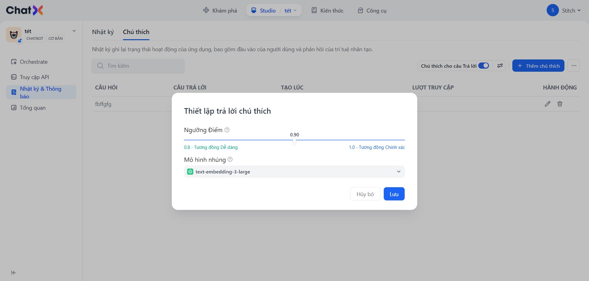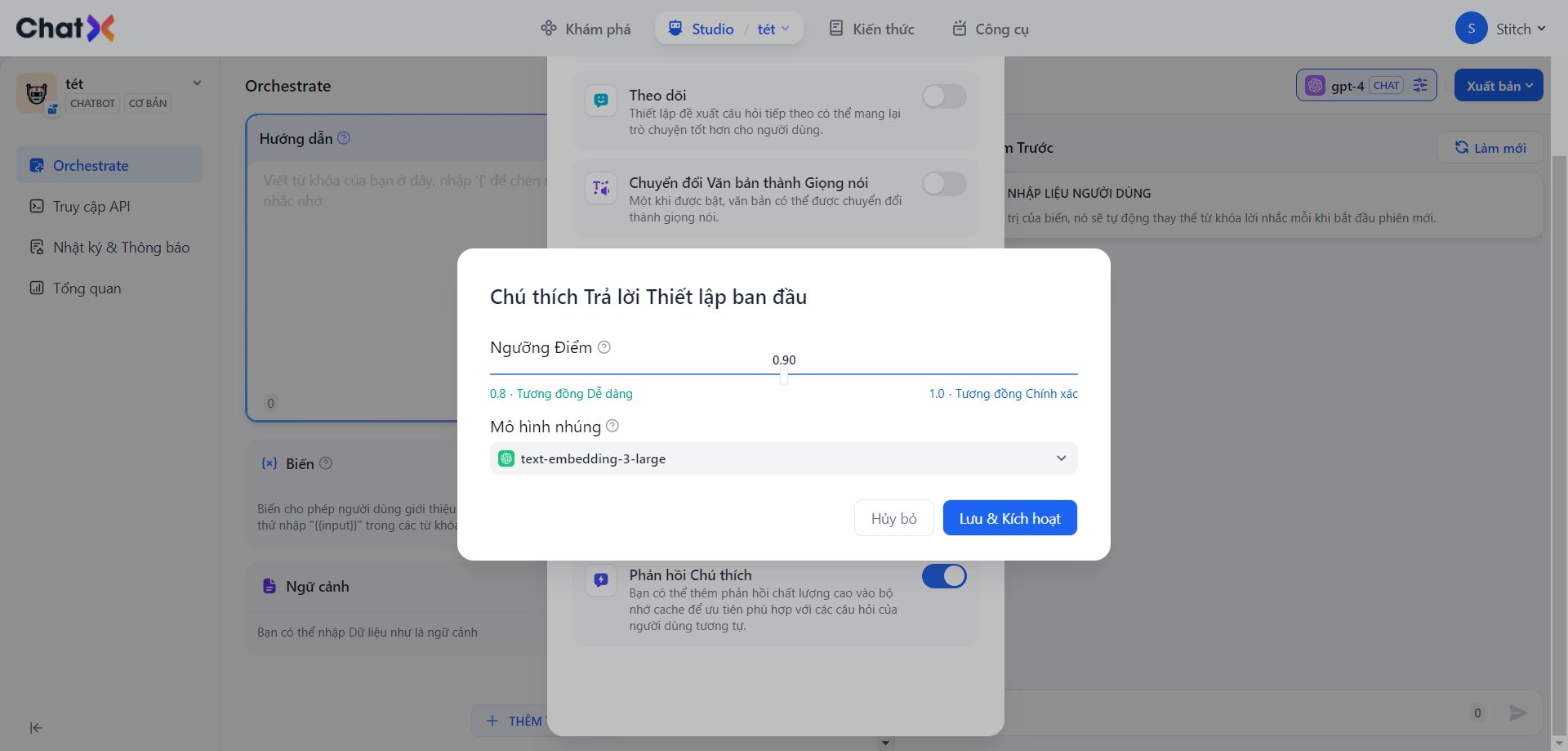 Bắt đầu bằng cách đặt các tham số cho Tính Năng Phản hồi chú thích. Bao gồm Ngưỡng điểm và Mô hình nhúng.