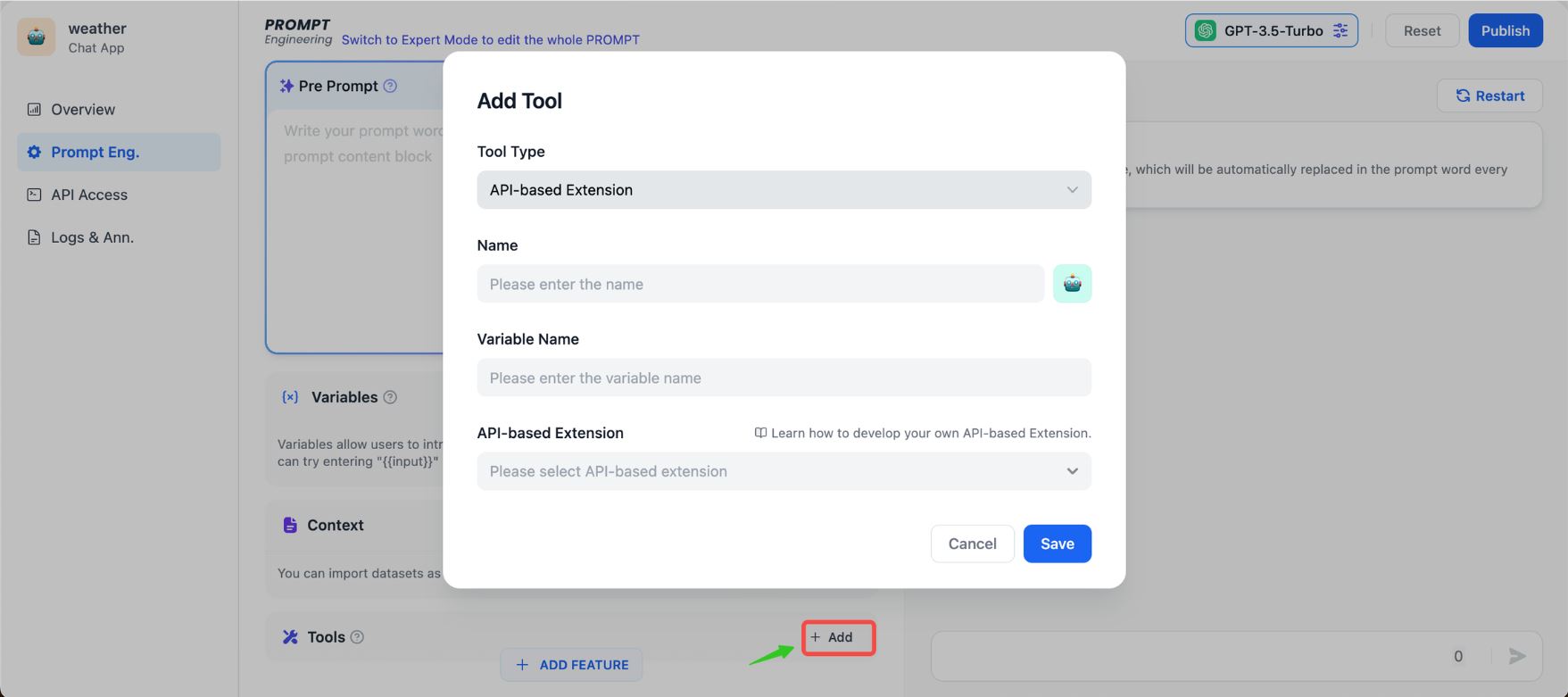 4. Trên trang sắp xếp prompt, nhấp vào nút "+ Thêm" bên phải "Tools", và trong hộp thoại "Thêm Công cụ" mở ra, điền tên và tên biến (tên biến sẽ được tham chiếu trong Prompt, vì vậy hãy sử dụng tiếng Anh), cũng như chọn mở rộng dựa trên API đã thêm ở Bước 2.