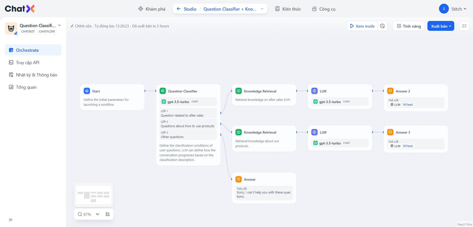 * **Chatflow**: Dành cho các kịch bản hội thoại, bao gồm dịch vụ khách hàng, tìm kiếm ngữ nghĩa và các ứng dụng hội thoại khác đòi hỏi logic nhiều bước trong việc xây dựng phản hồi.