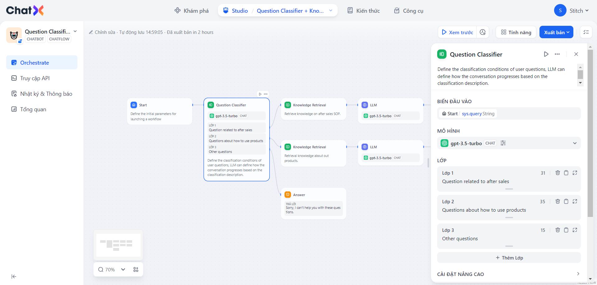 Nút Question Classifier xác định các điều kiện phân loại cho các truy vấn của người dùng, cho phép LLM quyết định sự tiến triển của cuộc đối thoại dựa trên các phân loại này. Như minh họa trong một kịch bản robot dịch vụ khách hàng điển hình, bộ phân loại câu hỏi có thể phục vụ như một bước sơ bộ đến việc truy xuất cơ sở kiến thức, xác định ý định của người dùng. Phân loại ý định của người dùng trước khi truy xuất có thể cải thiện đáng kể hiệu suất gợi lại của cơ sở kiến thức.