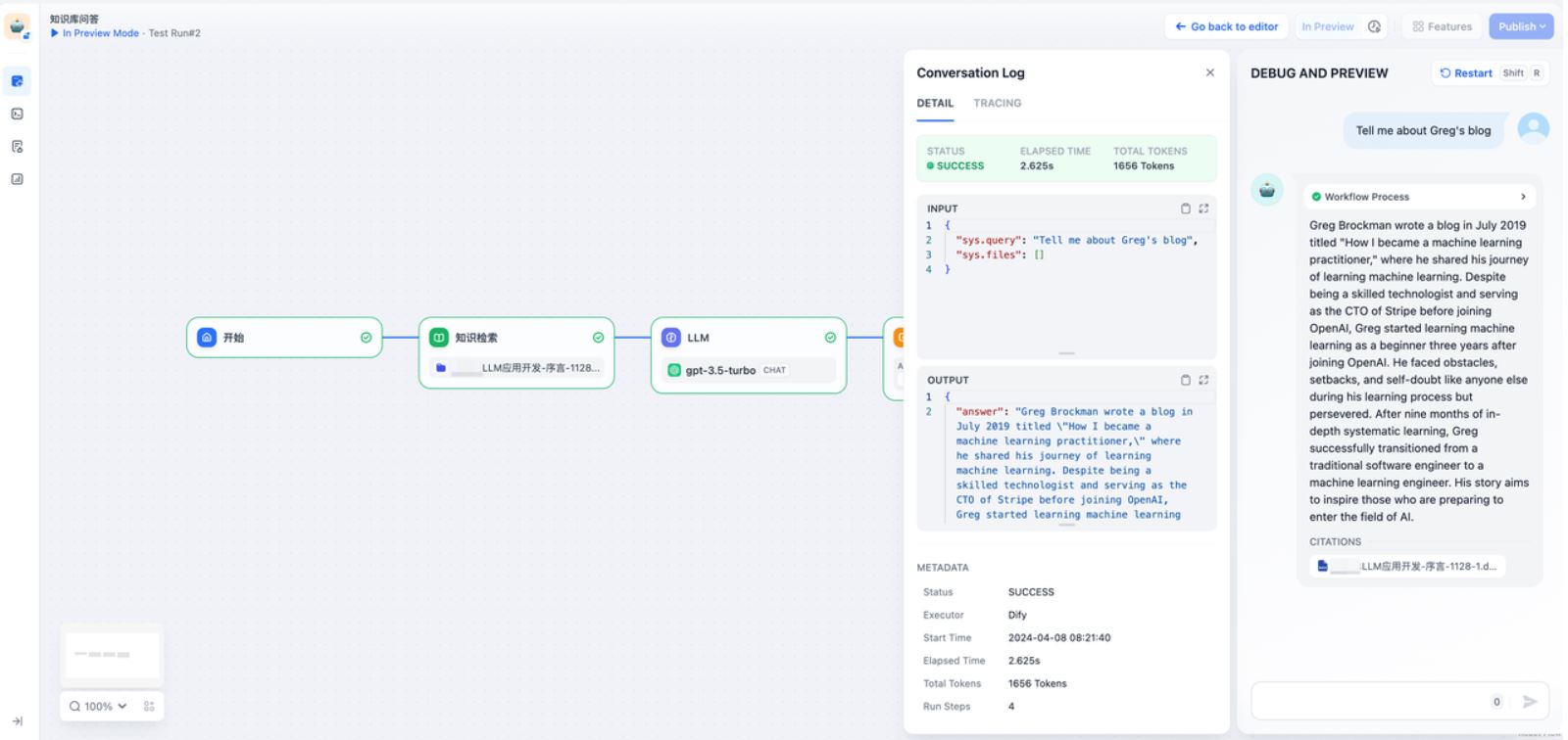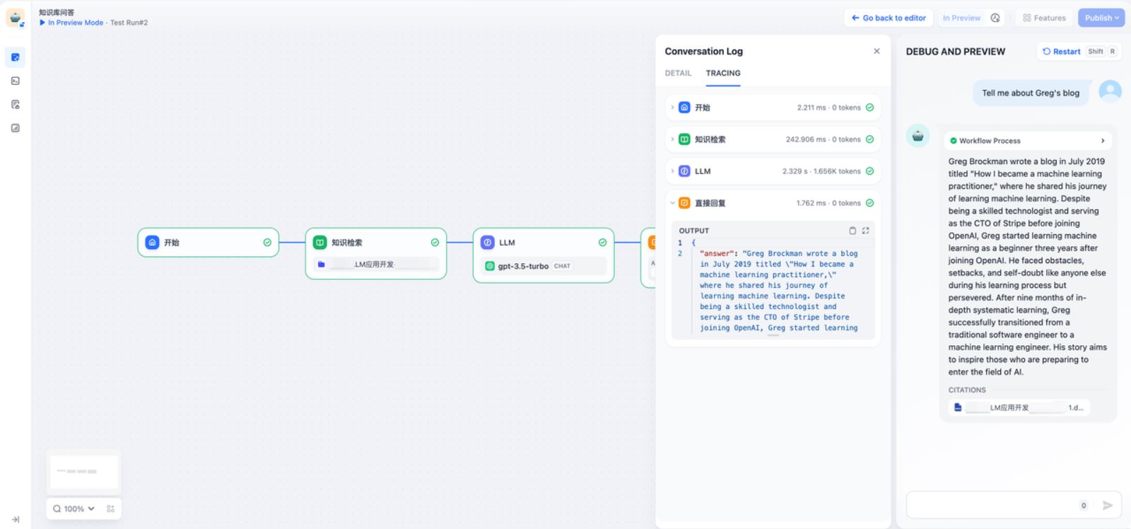 Nhấp vào "View Log—Trace" cho phép bạn xem lại đầu vào/đầu ra, tiêu thụ mã thông báo, thời lượng thực thi, vv., của mỗi nút trong suốt quá trình thực thi hoàn chỉnh của quy trình làm việc.