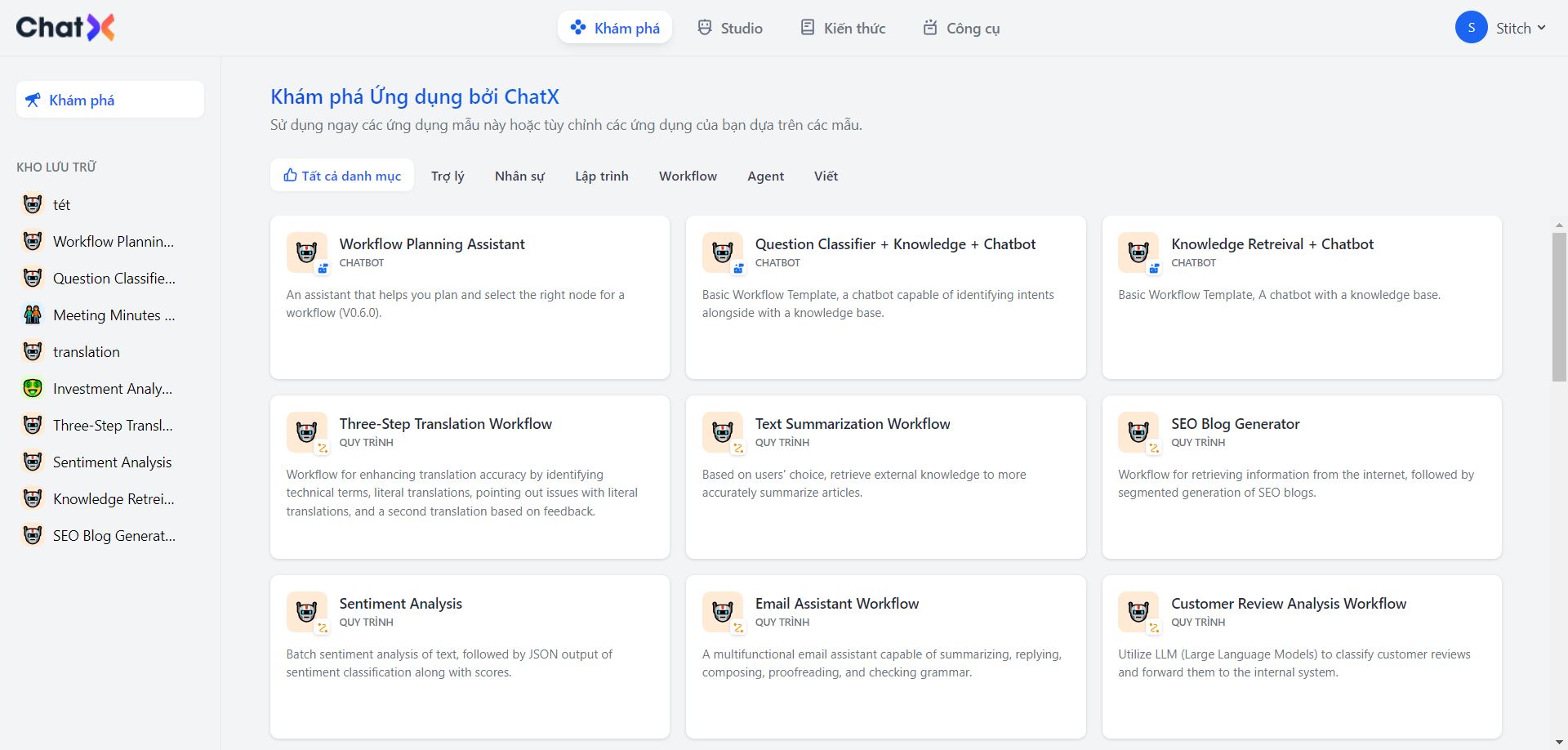 Trong **Khám phá > Khám phá**, một số ứng dụng mẫu phổ biến được cung cấp. Các ứng dụng này bao gồm dịch, viết, lập trình và trợ lý.